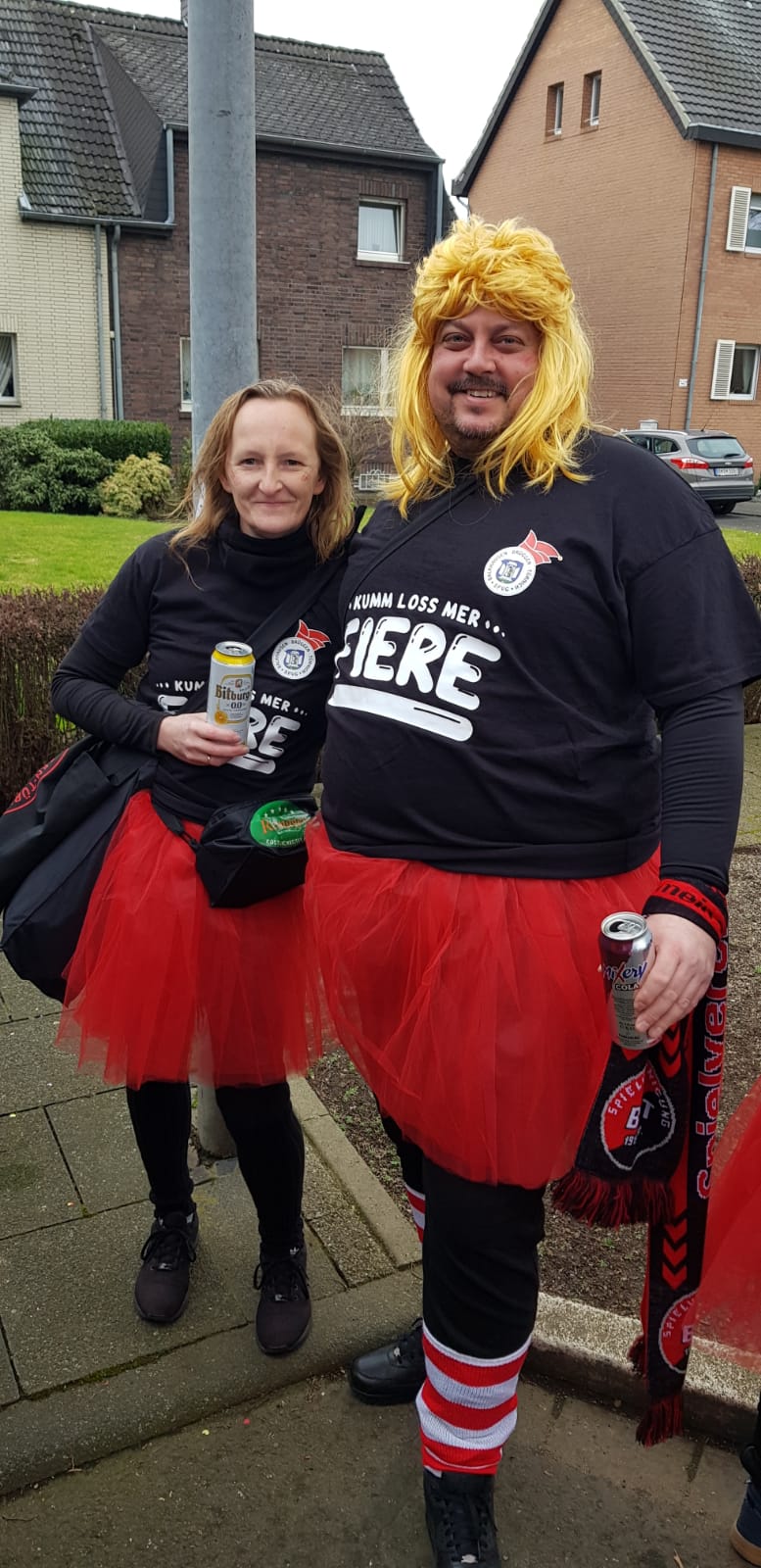 Ausgestattet mit schwarzen und roten Tütüs und dazu passenden Karnevalsshirts zogen wir durch die Straßen von BBT. Dabei zierte erstmals eine Narrenkappe das Logo unserer Spielvereinigung.